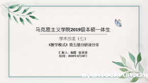 马克思主义学院2019级本硕一体生本着“停课不停学,停课不停研”的原则,在2020年4月19日早上如期开展了第七期学术沙龙。本期学术沙龙围绕经典文献《教学模式》的第五部分和学科教学论文的写作进行研讨。此次活动由2019级本硕一体生杨霞和张涛涛两位同学主持。
