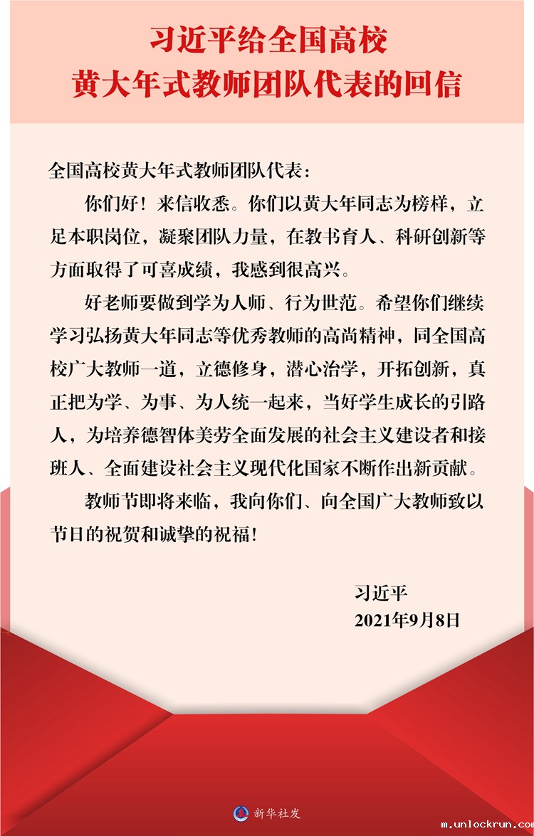 新华社北京9月9日电 在第三十七个教师节来临之际,中共中央总书记、国家主席、中央军委主席习近平9月8日给全国高校黄大年式教师团队代表回信,对他们寄予殷切期望,并向全国广大教师致以节日的祝贺和诚挚的祝福。
