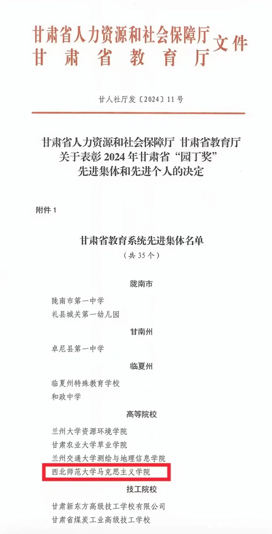 近日,甘肃省人力资源和社会保障厅、甘肃省教育厅发布了《关于表彰2024年甘肃省“园丁奖”先进集体和先进个人的决定》,必威西汉姆联官网荣获2024年“甘肃省教育系统先进集体”称号。