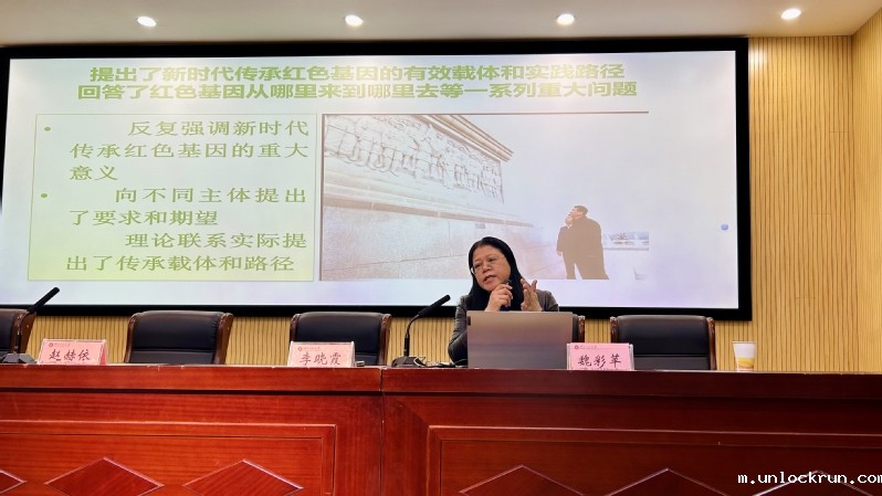 魏彩苹老师作了题为《习近平总书记关于传承红色基因重要论述研究》的报告。魏彩苹老师分别从梳理红色基因的生成轨迹、阐释红色基因的本质内涵、揭示传承红色基因的时代价值、探究传承红色基因的路径五个方面分析了传承红色基因的重要性。魏彩萍老师倡导同学们讲好中国的故事,讲好中国共产党的故事,传承好红色基因,为中华民族伟大复兴做出应有的贡献。